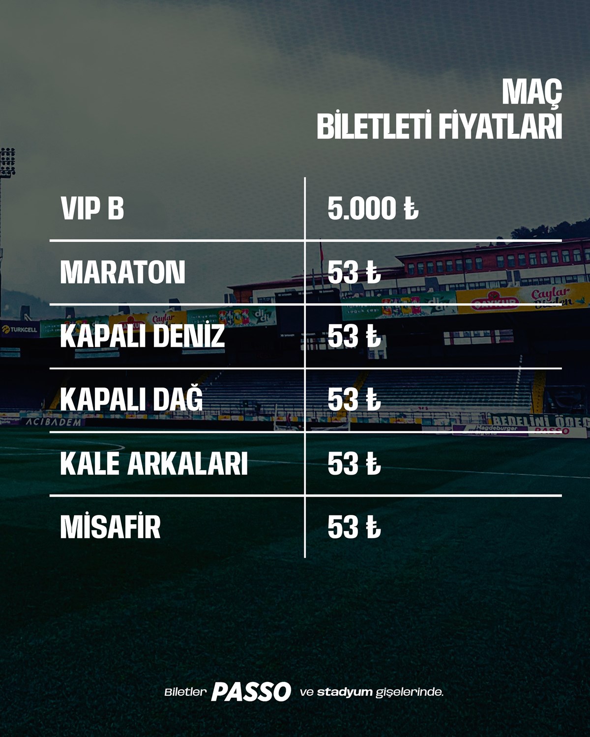 Kendi tribünlerinin çoğunu plakalarının numarası olan 53 olarak belirleyen Rizespor, Trabzon taraftarının yer alacağı deplasman tribünü bilet fiyatlarını da 53 TL’ye satışa çıkardı.