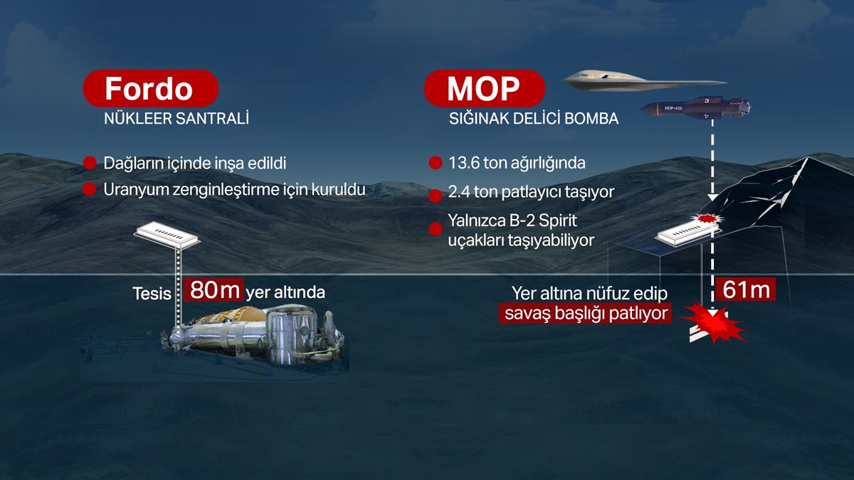 Saldırıların başından bu yana sıklıkla İran’ın farklı noktalarındaki nükleer tesis ve altyapılar İsrail’in hedefi oluyor. Ancak İran, nükleer tesisleri bu tarz saldırılara karşı korunması için yerin metrelerce altına inşa edilmiş durumda. İran’ın sahip olduğu 2 nükleer zenginleştirme tesisinden biri olan Tahran’a 161 km mesafedeki Fordo’ya, ancak ABD’nin elindeki GBU-57 tipi sığınak delici bombalarla yapılan bir saldırının etkili olabileceği biliniyor. İsrail’in bu tesise hasar verebilecek bir bombaya sahip olmadığı için ABD’yi savaşa çekmek istediği belirtiliyor.“PATLAMA ALANINDA SINIRLI KALABİLİR” Peki korkulan olur da ABD İsrail’in yanında savaşa dahil olur ve Fordo’ya sığınak delen bombayla saldırırsa bu durum nükleer bir felakete yol açar mı? Alabama Üniversitesi’nden bilim insanı Emily Caffrey patlamayla ortaya çıkabilecek gaz bulutunun çok uzağa gidemeyeceğini söylüyor. Uranyumun gaz hali olan Uranyum Heksaflorid’in çok ağır bir gaz olması nedeniyle bölgeden çok uzak noktalara taşınmasının düşük bir ihtimal olduğunu belirtti Caffrey, bu yüzden nükleer kirliliğin vurulan alanla sınırlı kalmasının beklendiğini ve yakında bulunmayanlar için bir tehdit yaratmayacağını düşündüğünü söyledi.